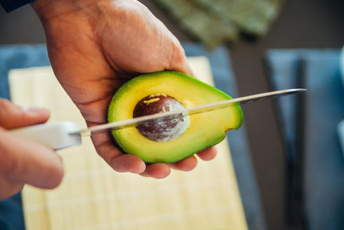 まずアボカドに縦方向にぐるりと一周切り込みを入れる。大きな種が真ん中にあるので、種に当たるまで包丁を入れ、包丁の方をぐるっと動かそう。そのままねじるように力を加えるとふたつに割れるので、種に包丁の腹を刺して捻り、種を実から外す。滑るのでくれぐれもケガには注意だ。皮はほどよく熟していればきれいにむける。