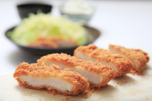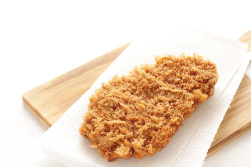 続いてのコツ、「二度揚げ」。これは、読んで字のごとく、二度揚げるものだがコツは温度。まずは160~170℃の低温でじっくりと揚げる。衣が薄いきつね色になったら取り出して、とんかつを立てるように置き、油をきる。次に油の温度を180℃に設定し、さらに数十秒揚げる。こんがりとキレイなキツネ色になったら取り出す。いたって簡単な二度づけと二度揚げを行うだけで、サクサクとした食感の美味しいとんかつができるので、ぜひ試してみてほしい。