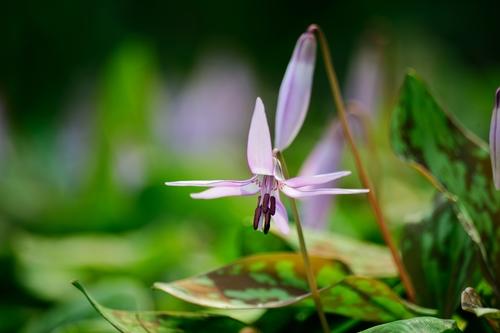 ユリ科カタクリ属の多年草、「カタクリ」。漢字にすると「片栗」で、かつては2㎝ほどの球根部分が、片栗粉の原料になっていた。しかし、生産できる量がごくわずかなため、現在は使用されていない。代わりにジャガイモやサツマイモが原料となっており、片栗粉の名称は継続して使われている。
