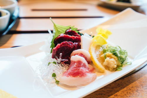 馬刺しは、薬味などを使って彩りよく盛りつけるのがポイントだ。オニオンスライス、大葉、刻みネギ、レモンの輪切りなどを用いると、見映えがよくなるだろう。ちなみに人は基本的に、左上から右下に視線を動かすようにものを見る。そのため、左奥から手前に向かって盛りつけていくと自然に見える。