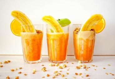 オレンジの準備が出来たら、乱切りにしたバナナとりんご、牛乳を加えて、とろりとするまでミキサーにかける。甘味が足りない時は、砂糖や蜂蜜などで調整しよう。もしオレンジの代わりにみかんの缶詰を使ったり、桃やパイナップルなどの缶詰も加えたりする場合は、缶の中のシロップの甘味が加わり甘めに仕上がるので、砂糖などは足さず、シロップの量で加減すればOKだ。
