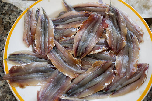 まず、マイワシを流水で洗い包丁で頭を切り落とす。次に腹に包丁を入れ内臓を取り出し、腹の中を水洗いする。マイワシは身が柔らかく小さいので、ここからは包丁ではなく手を使って、骨に沿って身を外していく。開けたら骨を取り除き、背びれや腹びれ、しっぽを包丁で切り落とせばマイワシの3枚卸しは完了だ。アンチョビを作る場合、マイワシの皮の取り除くこともあるのだが頭のほうから剥くようにすれば簡単に取り除くことができる。