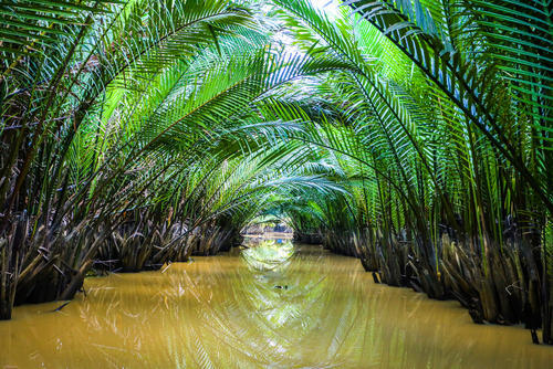 ニッパヤシは、川と海水が混ざり合う湿地帯で生育する。葉は斜め上方向に3~10mの長さまで成長し、緑色をした羽根状に広がる美しい姿が特徴だ。