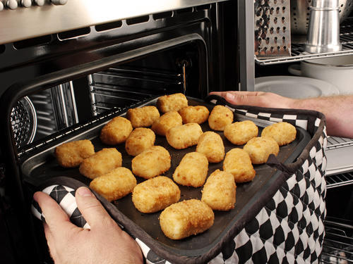 この調理法は油を使用せずにオーブンで焼いていく。下ごしらえから小麦粉、溶き卵、パン粉をまぶして衣をつけていく段階までは通常の作り方と同様だ。オーブンシートを敷いたオーブンの板に、衣をつけたコロッケをのせていこう。200~220℃に温めたオーブンで