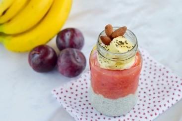 より華やかな色合いにしたいという場合は、プラムとバナナだけでなく、ラズベリーやブルーベリーを用意しよう。これらを多めに加えてミキサーにかけると、きれいなピンク色になる。このピンク色のスムージーをソースとして、バニラアイスクリームやフローズンヨーグルトの上にかけ、プラムやバナナをスライスしたものや、アーモンド、くるみなどを飾れば完成だ。