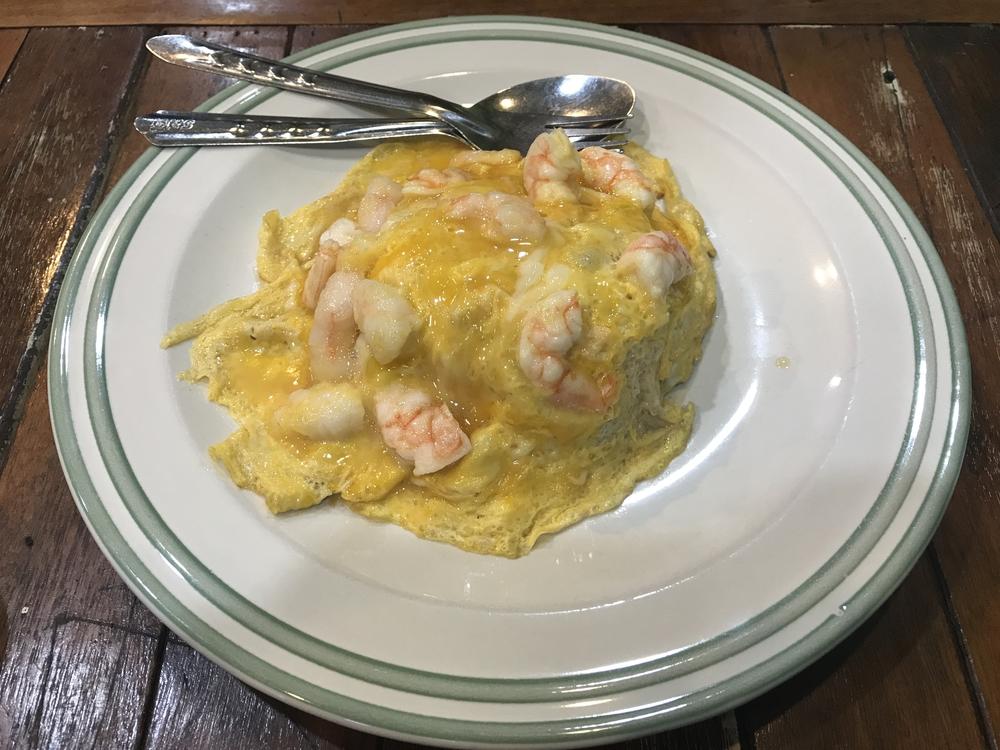 材料/むき海老、卵、玉ネギ、ショウガ、紹興酒