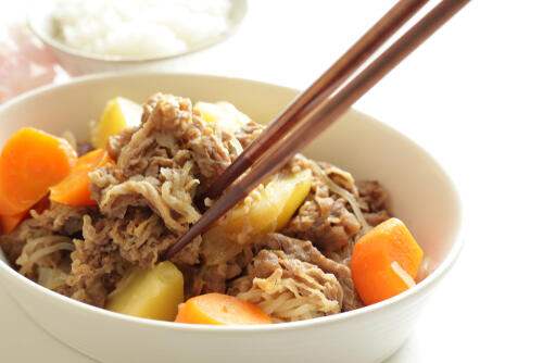 肉巻きポテト作りに欠かせないじゃがいも選びのポイントは、あまり大き過ぎず表面がなめらかでハリがあり、皮が薄くシワがないものを選ぶこと。メークインは形がややへん平で重く、男爵は形が丸いものを選ぶとよい。避けたほうがよいのは、いずれの品種もキズや褐色の斑点があるものだ。また、じゃがいもは日光が当たる所で保存した場合に皮が緑色に変色する。この緑色に変色した部分や発芽部分には有害成分のソラニンが含まれており、不用意に食べると中毒症状を起こす危険性もある。保存中に変色や発芽がみられたら、完全に取り除いて調理するようにしてもらいたい。