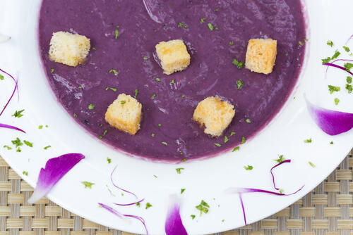 さつまいものポタージュを作るときに紫芋を使うと、鮮やかな紫色に仕上がる。一般的なさつまいものポタージュはクリーム色なので、インパクトのあるポタージュになるだろう。また、クルトンや油で揚げたさつまいもチップをトッピングするのもおすすめ。見ためがオシャレになるだけでなく、カリッとした食感もプラスされる。ポタージュだけでは飽きてしまいがちだが、浮き身をプラスすることで最後まで飽きずに楽しめるのだ。残ったスープにごはんを加え、チーズをのせて焼けば手軽なドリアも作れる。ベーコンなどを加えて作ると、ほどよい塩気が加わって美味しくなるだろう。