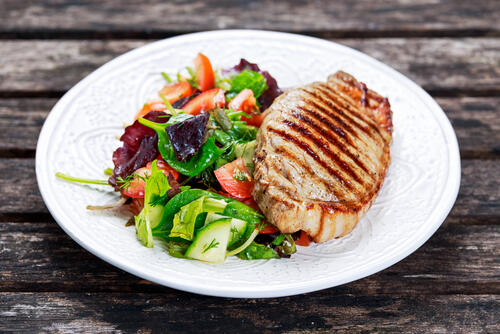 最後にポークステーキをサラダで味わうのにおすすめのソースを紹介しよう。使用する材料は酢・オリーブオイル・塩・ブルーベリージャムだ。作り方は簡単で材料をすべて混ぜ、1.5cm幅にカットしたポークステーキやベビーリーフ、焼いたかぼちゃにかければOK。ブルーベリーのさわやかな風味が豚肉やかぼちゃとよく合う。