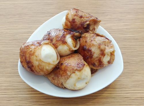 最後に肉巻き卵のアレンジレシピを紹介しよう。アレンジレシピのひとつが、うずらの卵を青じそと豚ロース薄切り肉で巻き、小麦粉・溶き卵・パン粉の順に衣をつけ、黒ごまをまぶしつけて、揚げ油で揚げる。さわやかな青じその風味と黒ごまの香ばしさが食欲をそそる。器に盛り付けたら中濃ソースとケチャップを1:1で混ぜたソースで食べるのがおすすめだ。冷めても美味しいので、弁当のおかずにもおすすめしたい。