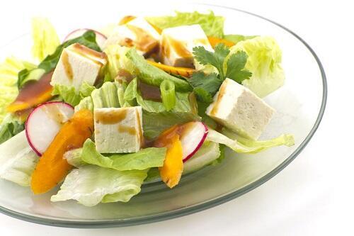 豆腐サラダは、野菜と同時に植物性たんぱく質を摂れるメニューだ。可能であれば、かぼちゃやトマトなどの緑黄色野菜をたっぷり使いたい。粉チーズをかけるのもよいだろう。