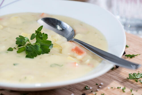 じゃがいもを使ったスープはさまざまだが、おおまかにはじゃがいもの形を残したスープと、すり潰してどろっとした食感に仕立てるポタージュ系のスープとに分けられる。じゃがいものスープの中でも最も一般的なのが、じゃがいもの形を残し、ほかの具材と一緒に単純に煮込んだスープではないだろうか。じゃがいもの食感を保ちつつ柔らかく煮込み、食べやすく仕上げる料理だ。