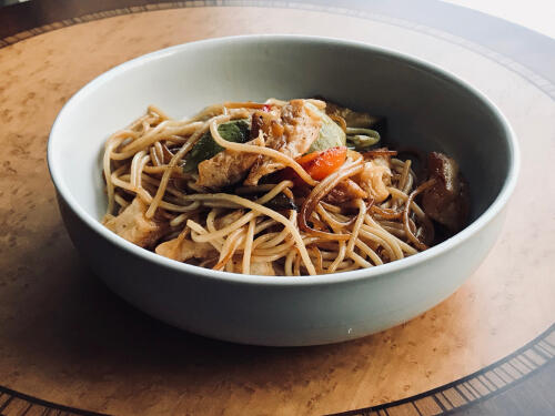 四川風といえば豚ひき肉を使用するイメージがあるが、鶏肉でもバツグンに美味しい。豆板醤やオイスターソース、にんにくをきかせたソースを絡めれば、坦々麺にも負けない麺料理になる。パスタを皿に盛り付けたあとは、生卵や目玉焼き、温泉卵などをトッピングするのがおすすめだ。