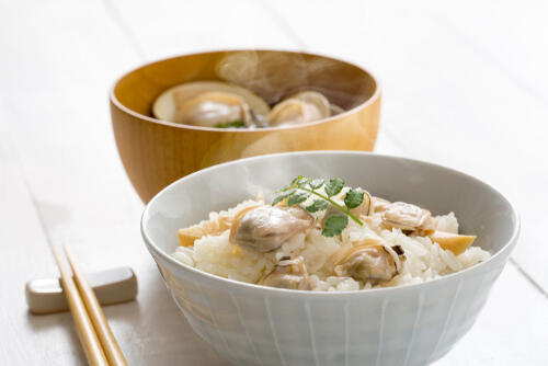 鍋に殻付きあさりと酒を入れ、浸るくらいの水を入れる。火にかけて殻付きあさりの口が開くまで煮ていく。次に茹で汁と殻付きあさりを分け、あさりは殻から身をはずし、茹で汁はペーパーで漉しちゃんぽんのスープとあわせる。続けて炊飯器に米と茹で汁、しょうゆを入れ目盛りまで水を足し、にんじんを加えごはんを炊く。炊きあがったら、あさりの身を入れて全体を混ぜ、茶碗に盛り付ければOK。好みで針生姜やあさつき、三つ葉をトッピングしても美味しい。
