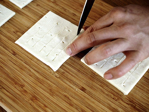手作りのパイ生地や冷凍のパイシートを伸ばし、好みの大きさにカットしていく。カットしたパイ生地の端には溶き卵を塗っておく。こうしておくことで、2枚のパイ生地がしっかりと密着するからだ。生地の真ん中に具材をのせて、もう1枚のパイ生地をのせてふたをしていく。この際、うえのパイ生地に切り目を入れておくといいだろう。最後に表面に溶き卵を塗って、200℃に予熱したオーブンで15分ほど焼いたら完成だ。