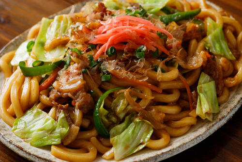 焼きうどんを構成するのは麺・肉・野菜。麺には炭水化物が豊富に含まれ、肉にはたんぱく質と脂質、野菜にはビタミン類が含まれている。一品で三大栄養素とほかの栄養を摂ることができる料理なのである。