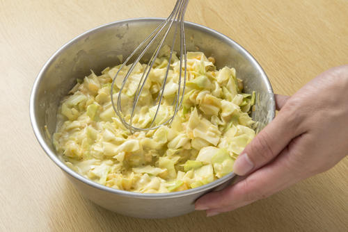 - (2)の生地が滑らかになったらキャベツを加えておく