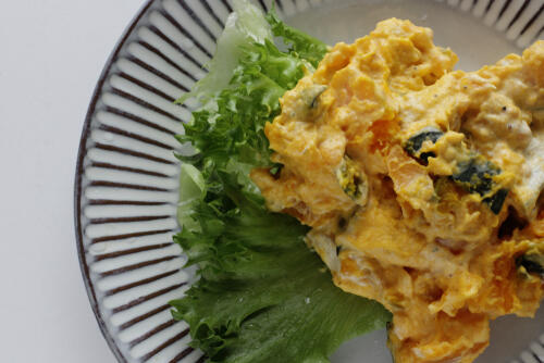 玉ねぎとかぼちゃの準備が完了したら、マヨネーズを加えて具材を和え、塩コショウで味の調整をしたら完成だ。電子レンジから取り出してすぐの熱々の状態でマヨネーズで和えてしまうと、マヨネーズが分離してしまうおそれがある。そのため、玉ねぎやかぼちゃの粗熱がとれてから和えることをおすすめする。
