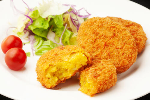 まずは、かぼちゃサラダをコロッケにリメイクする方法から紹介していこう。サクサクとしたコロッケの衣と、クリーミーなかぼちゃサラダの食感は相性バツグンだ。ちなみに、クリームチーズやヨーグルト、マヨネーズなどを多く入れて粘度があまりないかぼちゃサラダの場合は、コロッケにアレンジしにくいため注意が必要だ。