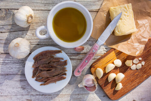 アンチョビのソースは当然ながらアンチョビを刻むだけではできない。サラッとしたソースにするためにはオリーブオイルを使う。つまりアンチョビをオリーブオイルになじませてソースを作るというわけだ。また、ソースの味のアクセントとしてにんにくと塩、こしょうも用意しておこう。