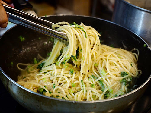 基本のアンチョビのソースはアンチョビとオリーブオイル、にんにく、塩、こしょうで作られるのだが、そこにバターを加えるとアンチョビのソースにコクが出るようになり、味わいがまろやかになる。ソース作りの最後にバターを加えればバターを焦がす心配もなく、バターの風味を残すことができる。