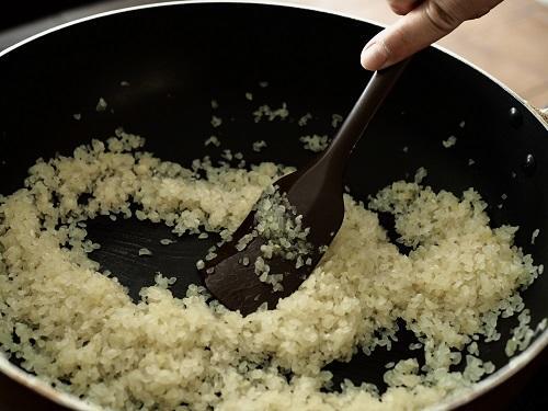 フライパンを使ったおからパウダーの作り方はいたって簡単だ。フライパンを強火で熱し、生のおからを入れてよく煎るのだ。この際、おからから湯気があがったら弱火にして木べらなどを使って10分ほどかき混ぜながら加熱する。そうすることで、生のおからの水分がなくなりパラパラとパウダー状になるのだ。