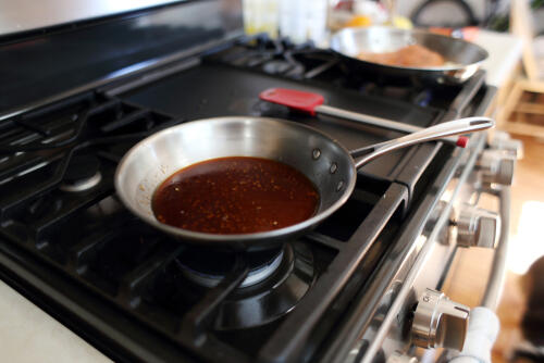 次に紹介するのは、デミグラスソースの時短な作り方だ。作り方は鍋に赤ワイン・トマトケチャップ・中濃ソース・しょうゆ・顆粒コンソメ・砂糖を入れ、よく混ぜてから火にかける。ひと煮立ちしたら弱火にして、3分ほどとろみがつくまで混ぜながら煮ていく。仕上げにバターを加え、さらに混ぜればデミグラスソースの完成だ。鍋で美味しく作るためのポイントは、ソースのとろみがつくまで煮詰めてコクを出すことだ。