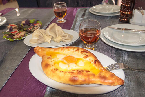 ハチャプリはジョージアでは専門店が存在するほどの人気者。チーズを使ったパンで、とくに知られているのがアジャルリハチャプリと呼ばれる卵がトッピングされたもの。舟形のチーズ入りパンはヨーグルトを加えてこねているから、もちもちの食感。その上にバターと卵をトッピングしているので、なんともまろやかな味わいになっている。ハチャプリは非常に種類が豊富で、スナック感覚で食べられるものも多い。日本人にも好まれる味わいであり、卵が乗っているものは見栄えもするので、トレンド入りする可能性もあり。