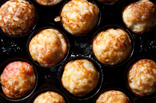 たこ焼きの生地は、カツオをベースにした出汁で作ることが多い。その生地に醤油やナンプラー、塩などで味をしっかりとつけて焼き上げることで、ソースなしで食べられるたこ焼きに進化する。やや濃い目に味をつけるとおつまみ感がアップする。