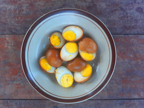 - 卵を取り出し、氷水に浸けて粗熱をとる