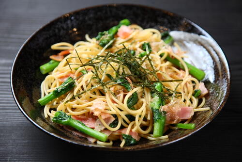 春を感じさせる菜の花に同じく春の訪れを知らせる、タケノコを合わせた和風パスタもおすすめだ。オリーブオイルをひいたフライパンに、ニンニクを入れ香りが出たら赤唐辛子を加える。さらに下処理をしてボイルしたホタルイカを加えて炒め、さらに茹でたパスタと菜の花、スライスした水煮タケノコを加えて炒める。最後にしょう油、塩こしょう、昆布茶で味を調えたら完成だ。タケノコの食感と昆布茶の旨みがよく合う、和風菜の花パスタになる。