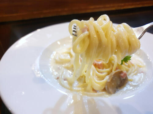 フェットチーネとは、平たいパスタでクリーム系と相性がいいパスタだ。オリーブオイルとにんにくを入れて熱したフライパンにエビや舞茸、マッシュルームなどの具材を入れて炒め、生クリームと牛乳を加えてひと煮たちさせたら、茹でたパスタと菜の花を加えて和えたら完成だ。