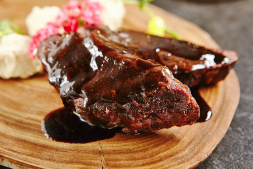 続けてフライパンに赤ワインを入れ1/3の量になるまで中火で煮詰める。鍋から牛肉を取りだし、ソースは目の細かなザルでこし鍋に戻す。煮詰めた赤ワインをソースに加えてよく混ぜ、牛肉を戻し塩こしょうで味を調えればOK。あとは器に盛り付け好みでマッシュポテトやイタリアンパセリを添えれば、デミグラスソースを使用した牛肉の赤ワイン煮の完成だ。