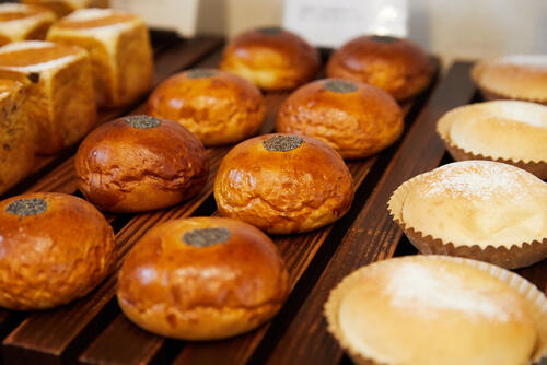 それぞれの生地を手で押して平らにしてから、あんこを包んでいく。焼く前の状態のあんぱんが6~8個できたら、クッキングシートを敷いた鉄板の上にあんぱんを並べて、はけを使ってあんぱんの表面に軽く黄身を塗って黒ごまを散らす。そのまま20~30分ほど生地を寝かせて二次発酵させる。生地がさらに大きく膨らんだ段階で約190℃に加熱したオーブンに入れて12分程度焼いていく。生地に焼き色がつきふっくらと膨らめばあんぱんの完成だ。