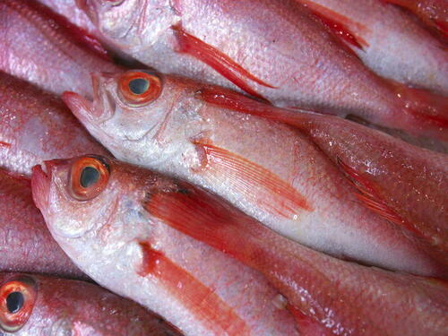 高級魚として知られるノドグロも実は別名。本来はアカムツ。千葉県の内房ではどんこと呼ぶこともある。40cm前後の体長で、体の色は赤。ギョロリとした目玉とスリムなシルエットが特徴的である。