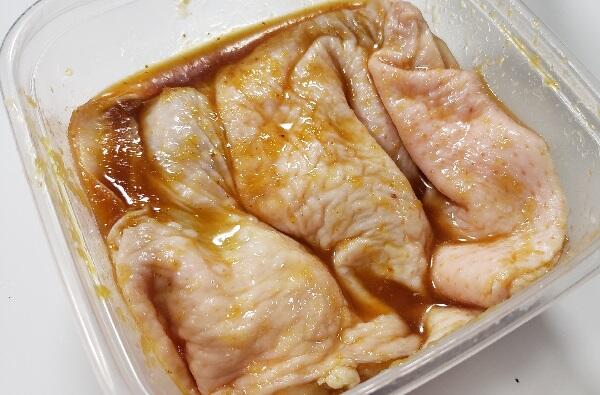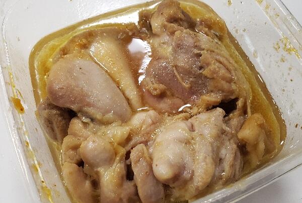 ②耐熱容器に鶏もも肉と『黄金の味 さわやか檸檬』を入れてよく揉む