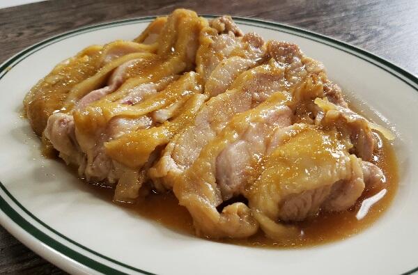 ④鶏肉をひっくり返し、電子レンジ600Wで1分40秒チンする。鶏肉に火が通っていることを確認し、完成