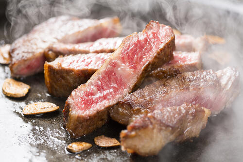 秋川牛は都内でも鮮度が高い状態で食べられるため、レアで食べるのがおすすめ。レアでも脂がしつこく感じず、口の中でスッと溶けていく。甘みのある脂と旨みの強い赤みが合わさり、極上の美味しさになるのだ。レアステーキを作る場合は厚めにカットしたステーキ肉を常温に戻し、両面を香ばしく焼きあげる。焼けた肉はアルミホイルなどにくるんでしばらく休ませてからカットすると、肉汁があふれ出てしまうのを防ぐことができる。焼いたあとにすぐカットするとせっかくの美味しい肉汁が出てしまい、旨みやジューシーさが損なわれてしまうので注意しよう。