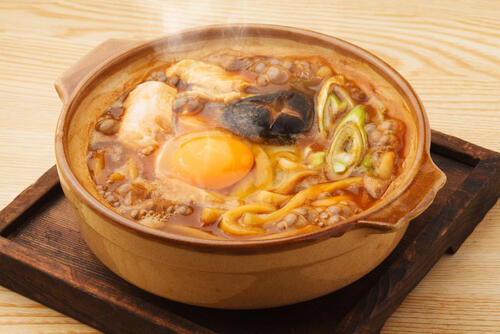 味噌煮込みうどんは、愛知県産の濃厚な赤味噌で味付けする料理である。基本的な具材は鶏肉、油揚げ、かまぼこ、ネギ、卵だが、ほかにも味噌煮込みうどんに合う食材はいろいろとある。味噌に合う食材を選べば大丈夫だ。