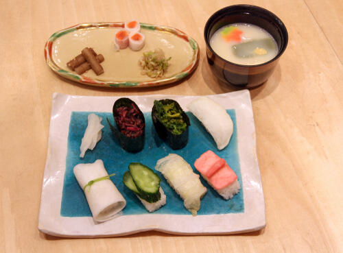 田舎ずしに使われるのは野菜と酢飯。野菜のほかにはこんにゃくが使われることも多く、いずれも低カロリーな食材ばかりだ。