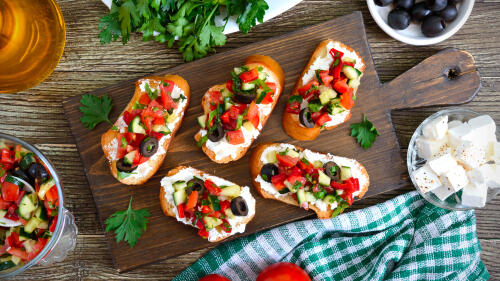 トマトや玉ねぎ、きゅうりなどの野菜を角切りにして、甘酢とオリーブオイルで漬けたマリネをバゲットにのせたもの。スモークサーモンやたこなどの魚介類を足しても美味しい。小さめにバゲットをカットしてピンやフラッグを刺せば、一口サイズのフィンガーフードとしても存在感を示してくれる。