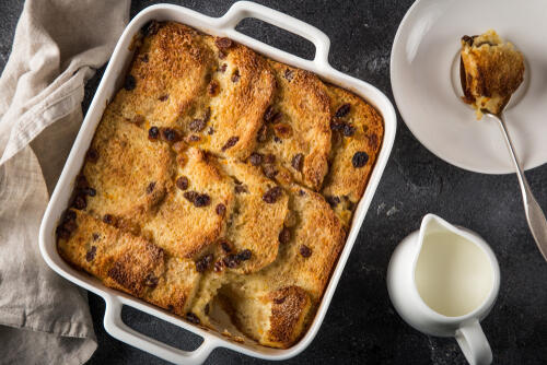パンを耐熱皿に入れて、卵液を加えてオーブンで蒸し焼きにしたもの。見ためがボリューミーで豪華なので、パーティー料理としても役立つ。レーズンや粉糖でデコレーションをして、華やかに飾ろう。
