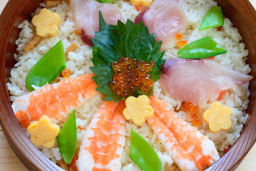 見栄えももっとかわいらしくしたい場合は、たまごメインの酒ずしやタイがメインの酒ずし、エビがメインの酒ずし...といったように数種類の酒ずし寿司を作って、カラーバリエーションを用意し、それらを一口サイズに切って交互に並べるといったアレンジを加えるのもおすすめだ。