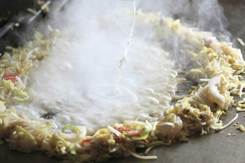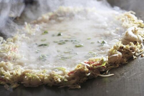 最初に、生地と軽く混ぜ合わせた具材を焼こう。なるべく生地を入れないようにするのがポイントだ。野菜を切るように混ぜ、プレートの中心にリング状に置く。生地はリングの中に流し込み、フツフツしてきたら食材と混ぜ合わせ、最後に平らに広げよう。