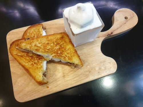 ヨーグルトを使う場合は、ヨーグルトが含む水分が問題となる。そのため、ヨーグルトは水きりが必須である。ヨーグルトとマシュマロを並べるように少し温めた食パンにのせて、トースターへ。できあがったあとは、シナモンやココアパウダーなどをふりかけるとより健全な朝食となる。