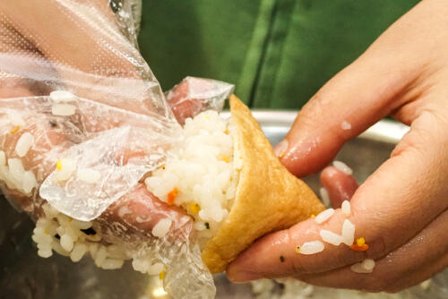 米が炊きあがったらすし酢、ゴマ、煮込んだ具材を加えてよくかき混ぜる。最後に、混ぜ込んだ具材入りのごはんを味付けした油揚げで包めば完成だ。
