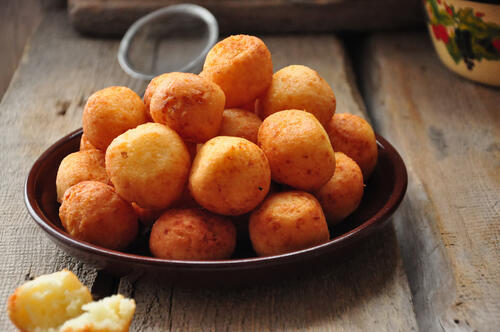 チーズボールの大きな特徴は、その生地にある。もっちりとしていて、ほんのり甘みがある生地でドーナツ生地に近い。揚げることで周りはサクサク、中はよりもっちりとした食感になるところが美味しさの要。熱々はもちろん、冷えても美味しいところもうれしい。