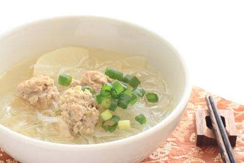 皆さんは大阪名物の肉吸いをご存知だろうか。肉吸いとは大阪人が二日酔いの日にサラッと食べることができるものはないかと、肉うどんをうどん抜きで頼んだのが発祥といわれている。具体的には関西風の出汁に薄切りにした牛肉を入れたもので、大阪では老若男女を問わず好まれているソウルフードだ。そんな大阪名物の肉吸いにうどんを加えてアレンジした牛肉の吸い物にうどんを加えすると献立の主菜になる。ボリュームがあるので、副菜は水分が多く1本でも約10kcalと野菜の中でもカロリーが低いセロリを入れた蒸し鶏の和え物をおすすめする。