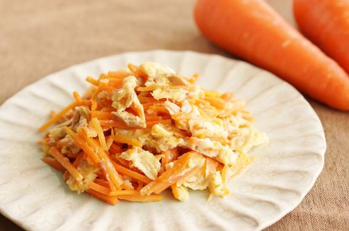 3ステップで作れるにんじんしりしりは、子どもといっしょに作ってみるのもおすすめだ。まず、大人がにんじんを5cmくらいの長さの千切りにする。次は、卵をボウルに割りほぐす作業だ。「失敗して当然!」という大きな心で、子どもにやってもらうのはどうだろう。ほぐすときに、塩だけでなくマヨネーズを入れると卵がふわっふわに仕上がるので、試してみてほしい。油を熱したフライパンで、にんじん、ツナの順に炒め、酒をふったら、最後に卵を炒め合わせて完成だ。