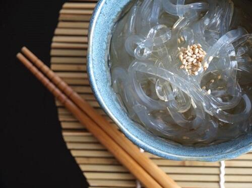 ところてんは、一般的には酢醤油や黒みつをかける食べ方が多いが、そのほかの食べ方をご存知だろうか。ところてん自体にはあまり味はなく、磯の風味が少しある程度のため、アレンジの幅は広い。おすすめは、野菜と合わせてドレッシングをかけた、ところてんサラダである。ところてんの食感が野菜との相性もよく、手軽に作ることができる。また、ところてんは酸味のきいた食材と相性がよいため、冷たい麺料理にも適している。ただし、ところてんは加熱すると溶けてしまうので、麺の代わりにスープと一緒に煮込んでしまうことのないよう、気をつけよう。